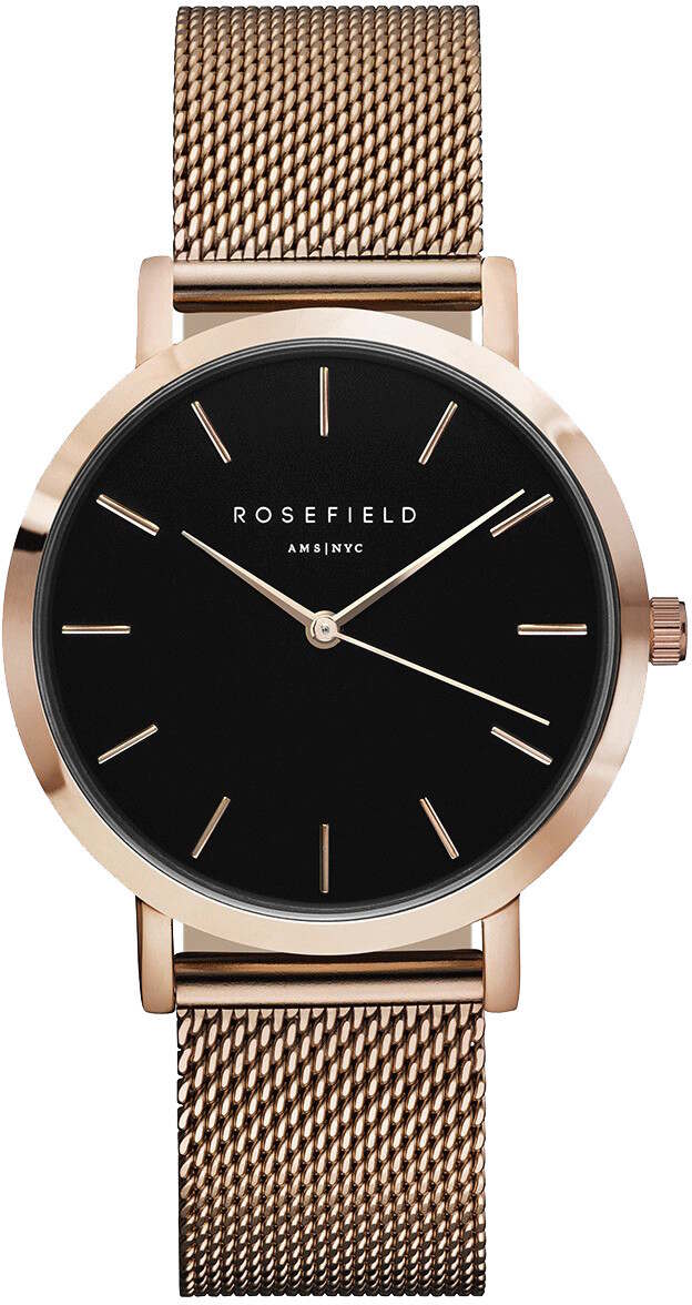 Rosefield Mercer MBR-M45 Black - Rose Gold -rannekellossa on musta kellotaulu ja ruusukullan värinen mesh-ranneke. Kellon rungon leveys on 38mm ja paksuus 8mm. Ranneke on kotikonstein säädettävissä 15,5-20,5cm pituiseksi.