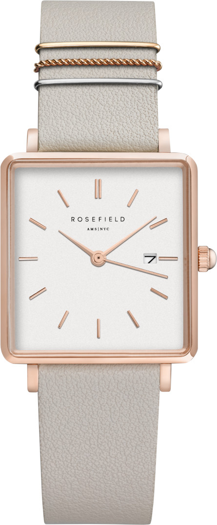 Rosefield The Boxy QOGRG-Q028- naisten rannekellossa yhdistyy moderni värimaailma ja minimalistinen muotoilu retroon nelikulmaiseen kellorunkoon. Kellossa on ohuet osoittimet ja päivyri, ja ranneke on vaaleanharmaata nappanahkaa. 16 mm leveä ranneke on säädettävissä 12,2 - 19 cm pituuteen, ja rannekkeessa on pikakiinnitys. Kaikilla Rosefield-kelloilla on 2 vuoden takuu, ja ne toimitetaan valmistajan alkuperäisessä pakkauksessa.