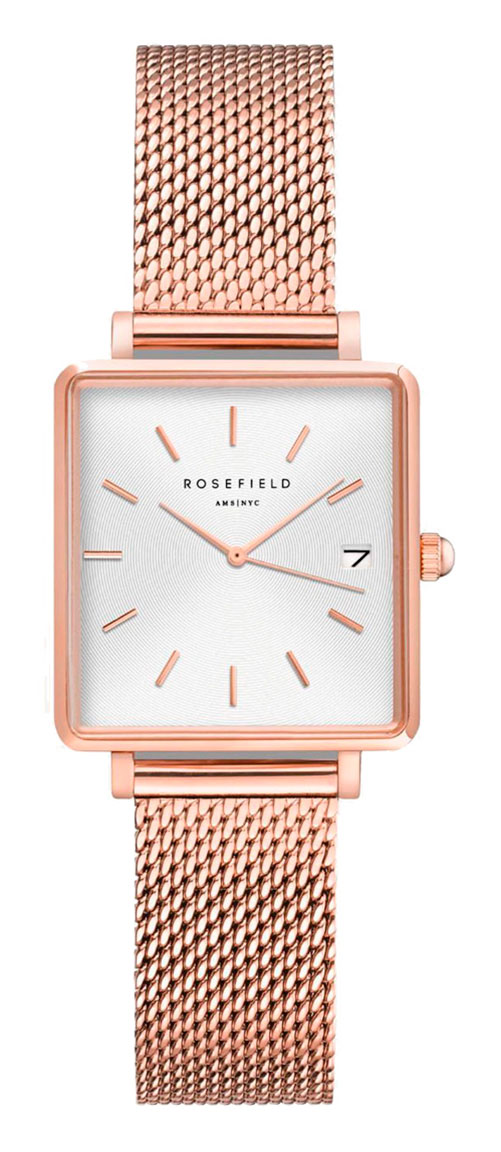 Rosefield The Boxy XS Mesh QMWMRG-Q040 Rose Gold on hieman retro, trendikäs ja huolettoman elegantti rannekello. The Boxy XS -mallisto on pienempikokoinen versio suositusta The Boxy -mallistosta. Kellossa on tyylikkäät pyöristetyt kulmat, ultra ohut kuori sekä päivyri toiminto. Tässä mallissa on punakullan värinen mesh-ranneke (ruostumatonta terästä) ja sen leveys on kiinnityskohdasta 12 mm. Pituutta voi säätää 120 – 180 mm pituuteen. Punakullan värinen runko on valmistettu myös ruostumattomasta teräksestä ja sen mitat ovat 22x24 mm. Runko on 6,4 mm paksu. Ranneketta voidaan vaihtaa muiden The Small Edit tai The Boxy XS -mallistojen rannekkeiden kanssa. The Boxy XS QMWMRG-Q040 -rannekellon vesitiiviysluokitus on 30m / 3atm, eli se on roiskevesitiivis.