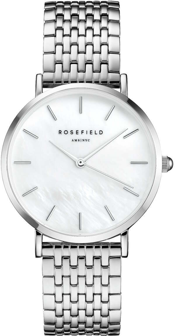 Rosefield UEWS-U22 The Upper East Side White MOP Silver -kellossa on hopeanvärinen teräsranneke sekä hopeanvärinen runko. Kellotaulu on vaaleaa helmiäistä, joka tuo kelloon tyylikkään sävyksen. Kellon rungon leveys on 33mm ja paksuus 7mm. Rannekkeen pituus on säädettävissä välillä 13-19cm.