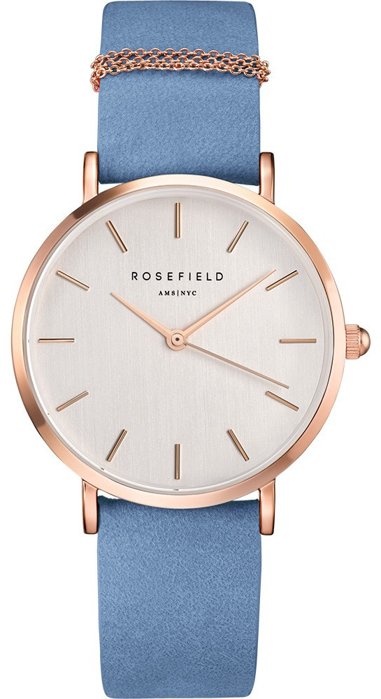 Rosefield WAGR-W76 The West Village -rannekello on kaunis ja hillitty. Kellon runko on valmistettu punakullan väriseksi pinnoitetusta ruostumattomasta teräksestä ja vaaleansininen ranneke on aitoa nahkaa. Uniikin tästä kellosta tekee sen rannekkeeseen ommeltu pieni koristeketju. Kellon rungon leveys on 33.3mm ja paksuus 7.8mm. Rannekkeen leveys kiinnityskohdasta on 16mm. Rosefield -kelloille myönnetään 2 vuoden takuu ja ne toimitetaan valmistajan alkuperäisessä pakkauksessa.