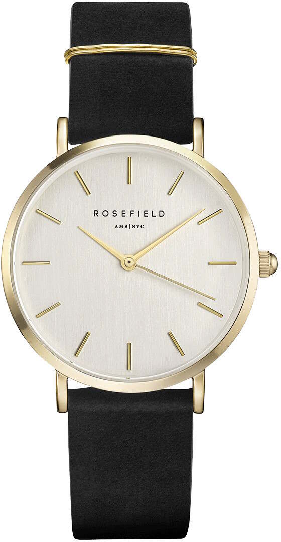Rosefield West Village WBLG-W71 Black - Gold -kellon rannekeessa on kauniina yksityiskohtana sirot metallirenkaat. Mallissa on musta nupukkinahkainen ranneke, kullanvärinen runko ja hopeanvärinen kellotaulu. Kellon rungon leveys on 33mm ja paksuus 7mm. Rannekeessa on solkilukko ja se on säädettävissä välillä 12-16cm.