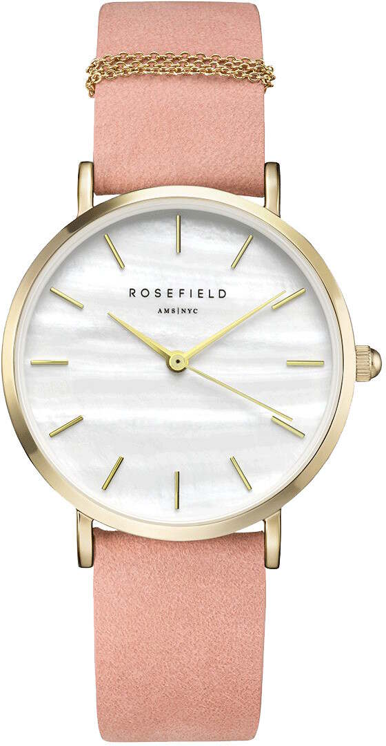 Rosefield West Village WBPG-W72 Pink - Gold -kellon rannekeessa on kauniina yksityiskohtana siro metalliketju. Mallissa on pinkki nupukkinahkainen ranneke, kullanvärinen runko ja helmiäis kellotaulu. Kellon rungon leveys on 33mm ja paksuus 7mm. Rannekeessa on solkilukko ja se on säädettävissä välillä 12-16cm.