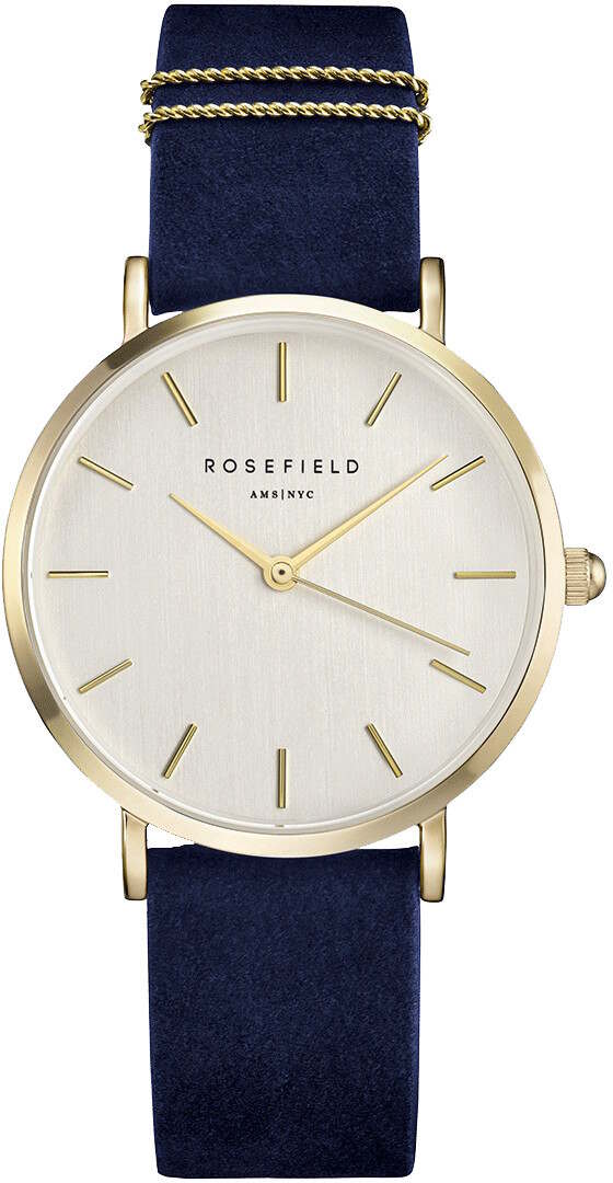 Rosefield West Village WBUG-W70 Velvet Blue - Gold -kellon rannekeessa on kauniina yksityiskohtana siro metalliketju. Mallissa on tummansininen nupukkinahkainen ranneke, kullanvärinen runko ja hopeanvärinen kellotaulu. Kellon rungon leveys on 33mm ja paksuus 7mm. Rannekeessa on solkilukko ja se on säädettävissä välillä 12-16cm.