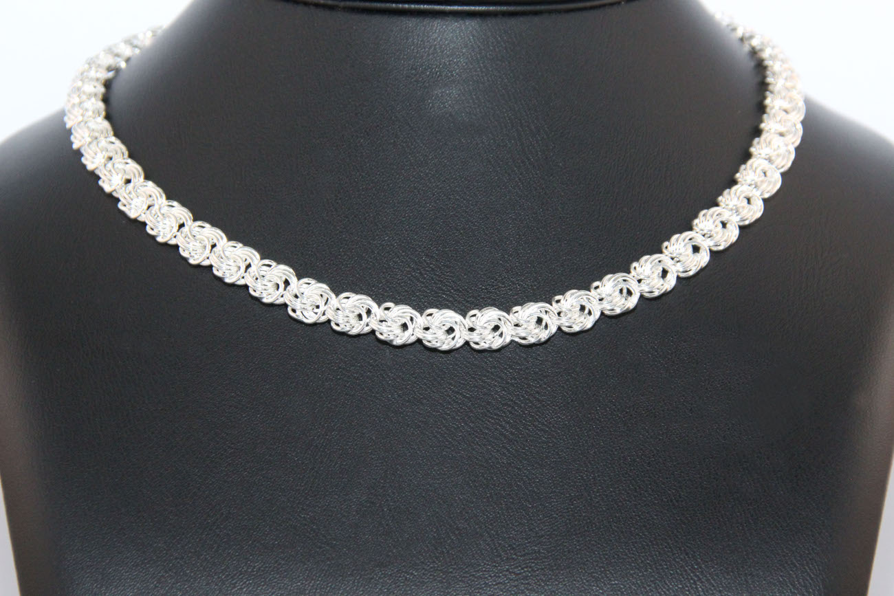Rosettakaulakorun ROS100-45 on kaunis korupunos koostuu pitsimäisistä solmuista, jonka ansiosta koru näyttää erittäin juhlavalta. Ketjun paksuus on 9,3 mm, ja korun pituus on 45 cm. Rosettakaulakoru on valmistettu sterling-hopeasta, ja siihen on saatavana myös yhteensopiva rannekoru.