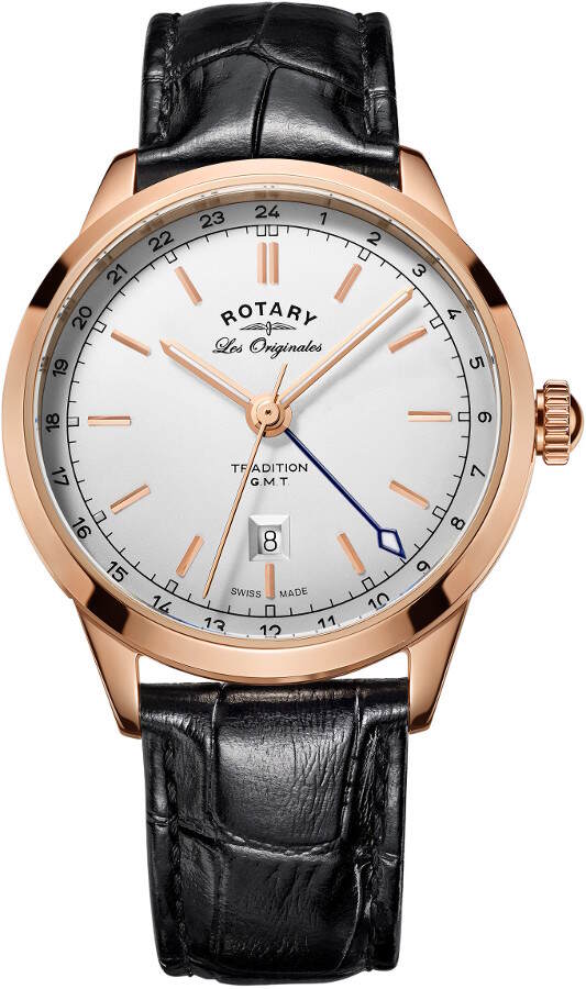 Rotary Tradition Gold Plated GMT Swiss Watch GS90183/02 -kellossa on erittäin kestävä, lähes naarmuuntumaton safiirilasi. Tämä Rotaryn malli on valmistettu Sveitsissä ja siinä on Sveitsiläinen Rondan paristokoneisto. Kellon runko on PVD pinnoitettu punakullalla, kellotaulu on valkoinen ja kokonaisuuden täydentää musta nahkaranneke. Kellon rungon leveys on 40mm ja paksuus 10,7mm. Rannekkeen leveys kiinnityskohdasta on 20mm. Kellossa on Rotaryn Dolphin Standard vesitiiviysmerkintä, joten se solveltuu uimiseen ja pintasukellukseen. Ominaisuuksina kellossa on kaksoisaika sekä päivyri. Laadukkaat sveitsiläiset Rotary-rannekellot toimitetaan valmistajan alkuperäisessä rasiassa!