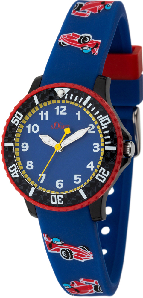 S. Oliver SO-3603-PQ lasten rannekello sopii perheen vauhtihirmulle ensimmäiseksi kelloksi. Kellossa on sinipunainen formulateema ja rannekelenkissä on kuvattuna ruutulippu. Helppoluluisen tästä kellosta tekee valkoiset viisarit ja selkeä numerointi, ja mustassa kellokehässä on erillinen numerointi, joka auttaa sekuntien lukemista ja opettelua. Kellon viisarit loistavat pimeässä. Kellon takakansi ja solki on kestävää ruostumatonta terästä ja 14 mm leveä ranneke on pehmeää joustavaa silikonia. Rannekkeessa on kaksi erillistä lenkkiä, jotka pitävät sen tiukasti kiinni eikä kello pääse putoamaan. Rannekkeen pituus on 12-17 cm ja rungon leveys on 30 mm.
