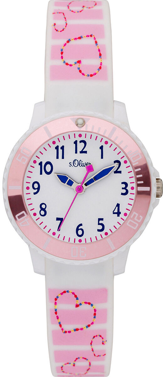 S. Oliver SO-3726-PQ lasten rannekellossa on suloinen vaaleanpunavalkoinen sydänteema. Valkoista kellotaulua koristaa lilat numerot ja viisarit, joita on helppo lukea ja kellotaulua ympäröi vaaleanpunainen numeroitu kellokehä mikä tekee numeroiden ja sekuntien lukemisesta ja opettelusta helppoa. Kellossa on 30 mm:iä leveä runko, ja takakansi ja solki on ruostumatonta terästä. 14 mm leveä ranneke on pehmeää joustavaa silikonia, ja rannekkeessa on kaksi erillistä lenkkiä, jotka pitävät sen tiukasti kiinni eikä kello pääse putoamaan. Rannekkeen pituus on 12-17 cm.