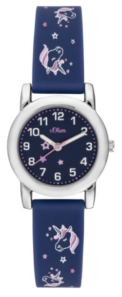 S. Oliver SO-3615-PQ lasten rannekellon ranneketta koristaa taianomaiset yksisarviset ja kellotaulussa on tähtikuviointi. Sinisessä kellotaulussa on valkoiset numerot ja viisarit, joita on helppo lukea, ja 27 mm:iä leveä ruostumaton teräsrunko on kevyt, mutta samalla kestävä ranteessa. Solki on ruostumatonta terästä ja 14 mm leveä ranneke on pehmeää joustavaa silikonia. Rannekkeessa on kaksi erillistä lenkkiä, jotka pitävät sen tiukasti kiinni eikä kello pääse putoamaan. Rannekkeen pituus on 12-17 cm ja rungon leveys on 30 mm.