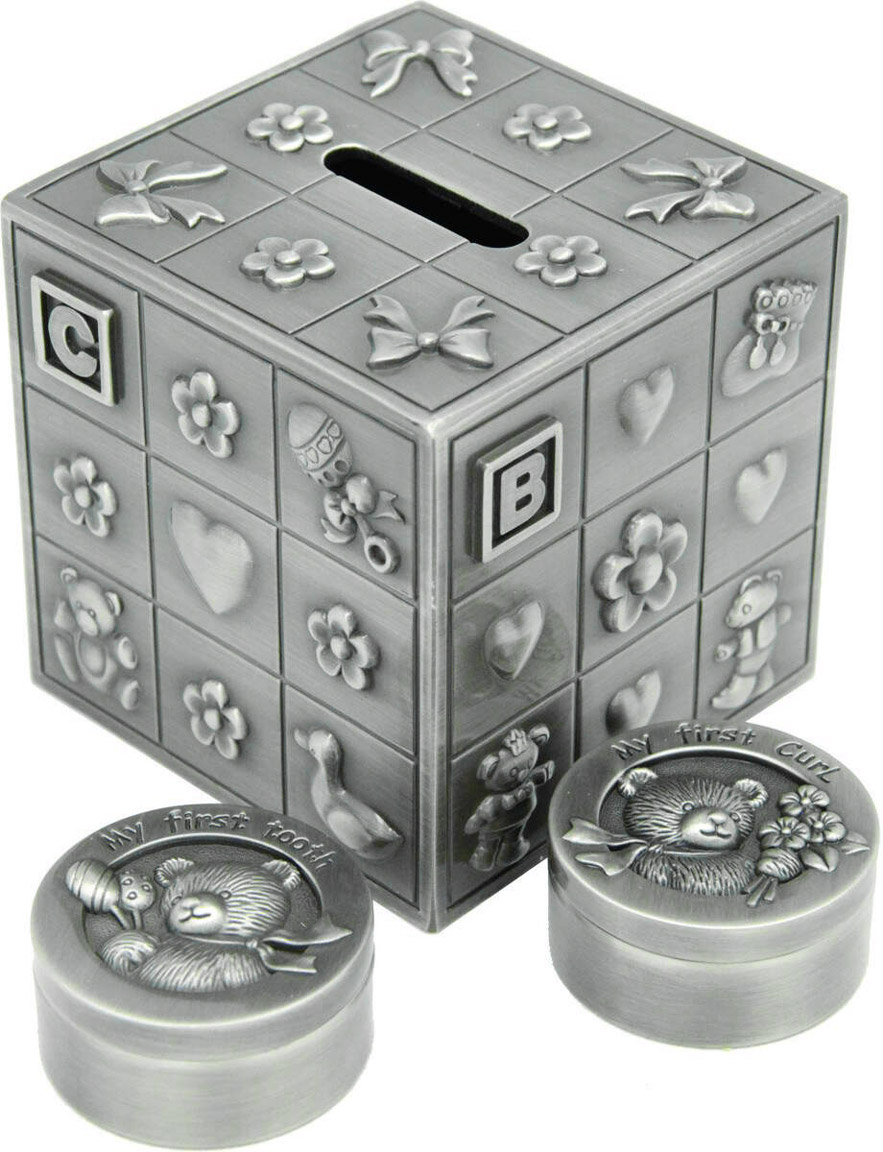 Säästölipas, ensihammas- ja ensikihararasia setti, CK1122. Palikka säästölipas kauniilla koristelulla ja rasiat suloisilla nallekuvilla.