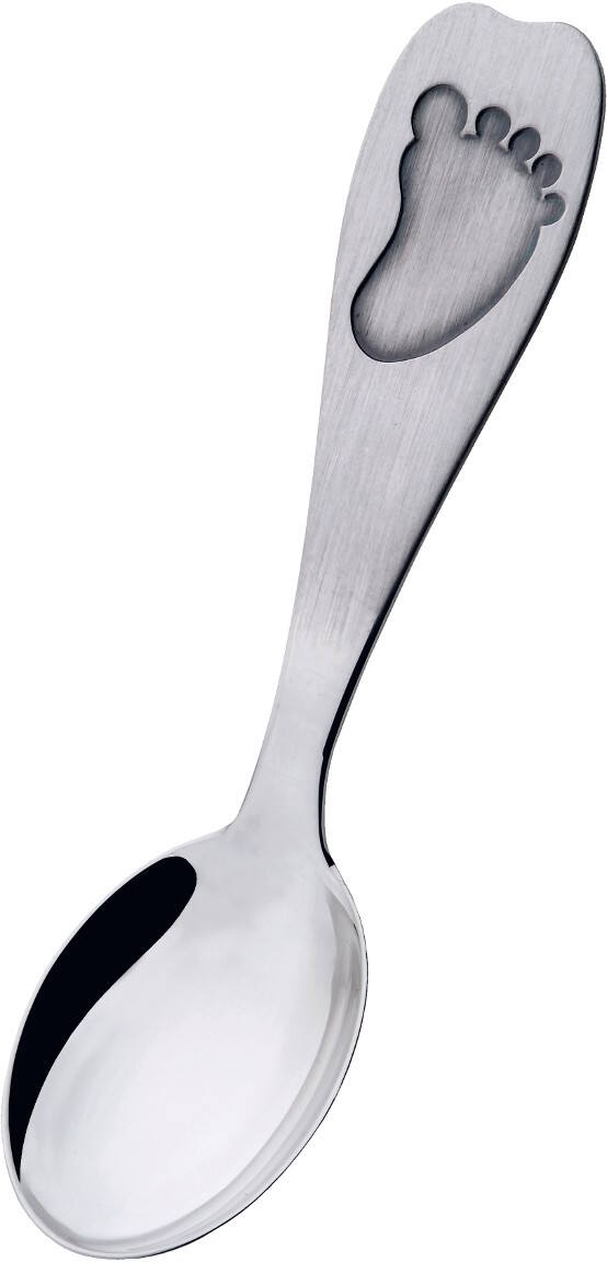 Saurum ensiaskel kummilusikka 113042000. Lusikassa on jalkapohjan kuva, joka kuvastaa lapsen ensiaskelta.