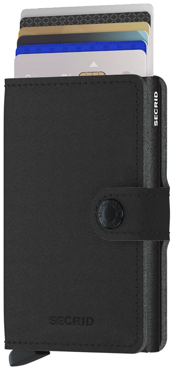 Saatavilla hienoja värejä. Secrid Miniwallet lompakkon alumiiniseen korttikotelo osaan mahtuu 6 korttia, jotka nousevat kätevästi porrastetusti ylös napin painalluksella. Porrastus helpottaa oikean kortin valitsemista. Lompakon nahkaosassa on vielä lisäksi tilaa neljälle kortille ja nipulle seteleitä. Lompakko suljetaan kätevästi kestävällä ja pitävällä nappikiinnityksellä. Lompakon ulkomitat ovat: 9,5cm x 6,5cm x 1,8cm.