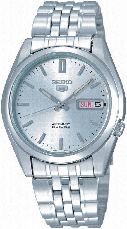 Seiko 5 Automatic SNK355K1 on klassinen hopeanvärinen automaattikello. Kellon kaksoispäivyristä näet viikonpäivän ja päivyksen yhdellä silmäyksellä. Nuppi on sijoitettu kätevästi klo 4 kohdalle ja näin se ei paina ranteeseen. Kellossa on Seiko Cal.7S26 automaattikoneisto. Kellon rungon leveys 37mm. Seiko kelloille myönnetään 2 vuoden takuu ja ne toimitetaan valmistajan alkuperäisessä rasiassa.