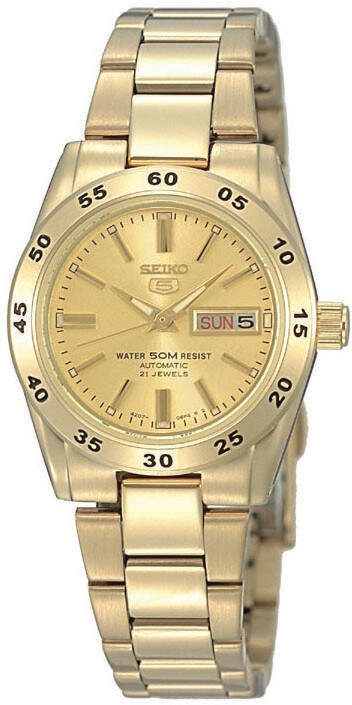 Seiko 5 Automatic SYMG44K1 on tyylikäs ja siro naisten kullanvärinen automaattikello. Kellossa on Seiko Cal.4207 automaattikoneisto, jota voidaan vetää myös käsin. Kellon rungon leveys 26mm ja paksuus 11mm. Seiko kelloille myönnetään 2 vuoden takuu ja ne toimitetaan valmistajan alkuperäisessä rasiassa.