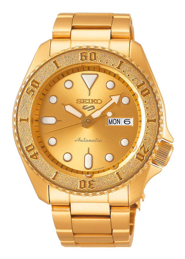 Seiko 5 Street SRPE74K1 on näyttävä miesten automaattikello. Kello on kokonaan väriltään keltakultainen ja se on valmistettu ruostumattomasta teräksestä. Kellossa on 42,5 mm leveä runko ja kellotaulua suojaa Seikon kehittelemä Hardlex-lasi. Kellon lumibrite-päällystetyt osoittimet ja indeksit luminoituvat valossa, jonka vuoksi kellon lukeminen onnistuu myös pimeässä. Kellosta löytyy viikon- ja päivämääränäyttö, pyörivä kellokehä ja kirkas takakansi paljastaa automaattikoneiston, jossa on 41 tunnin käyntivara. Koneiston voi vetää myös käsin ja sen käyntitaajuus on 21 600 värähdystä tunnissa. SRPE74K1 kuuluu vesitiiviysluokkaan 10 atm / 100 m ja on uintitiivis.