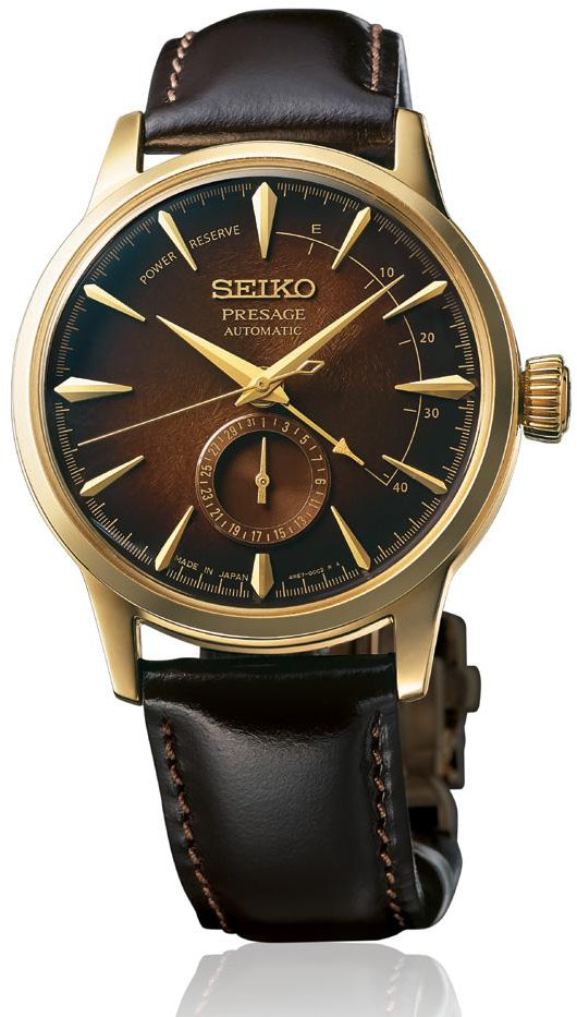 Seiko Presage Automatic Cocktail Time SSA392J1 Limited Edition on väriltään kuin Old Fashioned, ravintolamaailman ehdoton klassikkodrinkki. Ulkomuoto rakentuu kultapintaisesta 41 mm teräsrungosta, aidosta ruskeasta nahkarannekkeesta sekä sävyihin upeasti sointuvasta kellotaulusta. Kellon koneisto on kaliiperiltaan 4R57, eli siinä on 29 kiveä ja n. 41 h käyntivara (taulun ulkoreunalla varausmittari). Kellotaulua suojaa hardlex-mineraalilasi ja myös rungon takakansi on lasipintainen, tarjoten mainion näkymän koneiston hienovaraiseen mekaniikkaan.