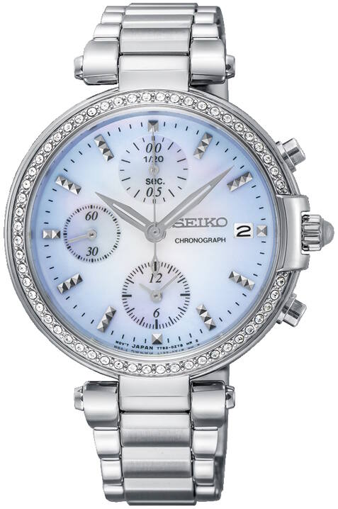 Seiko SNDV39P1 Swarovski crystals on klassisen tyylikäs naisten Seiko-kronografikello, jossa on tarkka 7T92-kvartsikoneisto. Rannekellon todella kaunista sinertävää helmiäistaulua koristaa selkeät osoittimet ja indeksit. Kellon kehässä hehkuvat 54 Swarovski-kristallia. Seiko SNDV39P1 -kellossa on myös selkeälukuinen päivämääränäyttö ja kronografitoiminnot. Rannekellon rungon halkaisija on 35,6 mm ja sen kellotaulua suojaa mineraalilasi. Ruostumattomasta teräksestä valmistettu runko ja ranneke antavat kellolle viimeisen silauksen. SNDV39P1 kuuluu vesitiiviysluokkaan 3 atm / 30 m eli kello on roiskevesitiivis.