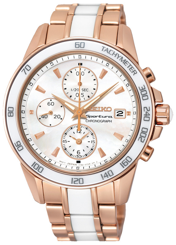 Naisten Seiko Sportura Chronograph SNDW98P1 punakullan värisellä rungolla. Kellon rungon leveys on 38mm ja rannekkeen 16mm. Kellotaulu vaaleaa helmiäistä. Kellon kehä sekä rannekkeen vaaleat osat ovat keramiikkaa. Lisäksi kellosta löytyy ajanotto sekä päivyri. Kellolla on kahden vuoden takuu ja se toimitetaan valmistajan alkuperäisessä rasiassa.