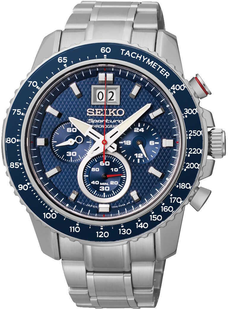 Tyylikäs Seiko Sportura Chronograph SPC135P1 miesten rannekello. Kellon runko ja ranneke ovat valmistettu ruostumattomasta teräksestä. Rungon leveys on 45mm ja rannekkeen 18mm. Kellon ominaisuuksina on päivyri sekä ajanotto. Lisäksi kellossa on naarmuuntumista kestävä safiirilasi. Laadukkaille Seiko kelloille myönnetään 2 vuoden takuu ja tuote toimitetaan valmistajan alkuperäisessä rasiassa.