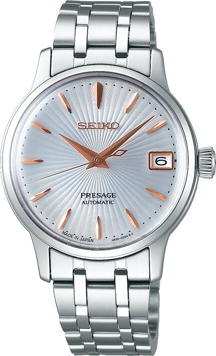 Seiko SRP855J1 Presage Automatic Ladies Cocktail on klassisen tyylikäs Seikon Presage-sarjan naisten automaattikello. Kellossa on laadukas 23-kivinen 4R35-automaattikoneisto, jossa on 41 tunnin käyntivara. Kelloa koristaa upea hopeanvärinen sunburst-kellotaulu, jossa on ruusukullanväriset indeksit ja osoittimet sekä selkeälukuinen päivyri. Ruostumattomasta teräksestä valmistetut runko ja ranneke antavat kellolle upean ulkoasun. Seiko SRP855J1 -kellon rungon leveys on 33,8 mm ja sen paksuus on 9,1 mm. Rannekellon takakannessa on lasi, jonka läpi voit ihailla koneiston toimintaa. SRP855J1 kuuluu vesitiiviysluokkaan 5 atm / 50 m eli kello on uintitiivis.