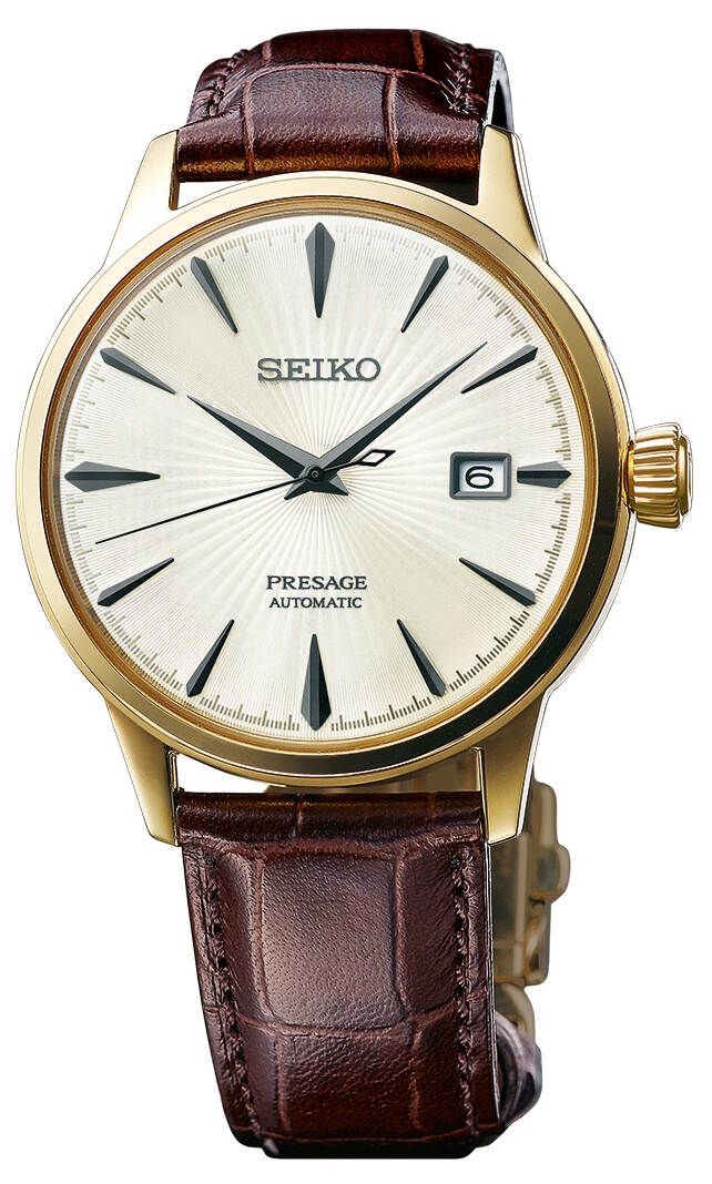 Seiko SRPB44J1 Presage Automatic Cocktail Time myötä Seikon suositut Cocktail Time mallit saapuvat myös suomeen. Kellossa on laadukkaasta ruostumattomasta teräksestä valmistetut kullanvärinen runko, ruskea nahkaranneke, kauniisti viimeistelty hopeanvärinen kellotaulu, kestävä Hardlex-mineraalikristallilasi. sekä läpinäkyvä lasinen takakansi. Kellossa on laadukas 23-kivinen Seiko 4R35 automaattikoneisto 41 tunnin käyntivaralla. Kelloa voi tarvittaessa vetää ajansäätönupista ennen käyttöönottoa. Kellossa on 4800 A/m antimagneettisuojaus. Kellon rungon leveys on 40,5 mm. Seiko SRPB44J1 Presage Automatic Cocktail Time toimitetaan valmistajan alkuperäisessä kellorasiassa, ja sille myönnetään Seikon virallinen kahden vuoden takuu.