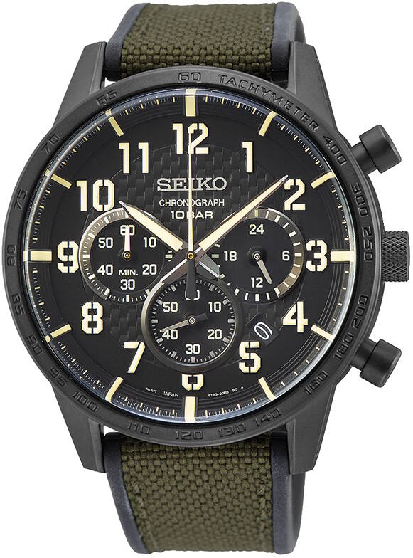 Seiko Urban Sports Chronograph SSB369P1. Tässä mallissa on musta kellotaulu, musta runko ja vihreällä kankaalla päällypuolelta päällystetty silikoniranneke. Ominaisuuksina päivyri sekä ajanotto. Kellon rungon leveys on 45,2mm. Kellossa on luminoituvat viisarit sekä indeksit. Seiko kelloille myönnetään 2 vuoden takuu ja ne toimitetaan valmistajan alkuperäisessä rasiassa.