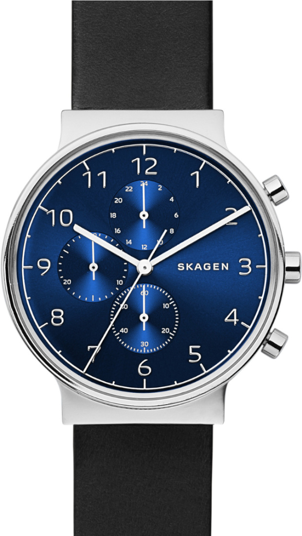 Skagen Ancher Chronograph SKW6417-rannekellossa on suuri kompassia muistuttava ruostumattomasta kiiltävästä teräksestä valmistettu pyöreä 40 mm:iä leveä runko ja tummansininen sunray-kellotaulu. Yksinkertaiset metallinväriset hieman ylisuuret osoittimet ja numeronäyttö erottuvat kauniisti sinisestä pohjasta. Kellossa on 24-tunnin näyttö ja ajanotto. Pikakiinnityksen vuoksi sininen aidosta nahasta valmistettu ranneke on helppo vaihtaa. Rannekkeen kiinnityskohdan leveys on 20 mm. Skagen-kelloilla toimitetaan valmistajan alkuperäisessä pakkauksessa, ja niillä on 2 vuoden takuu.
