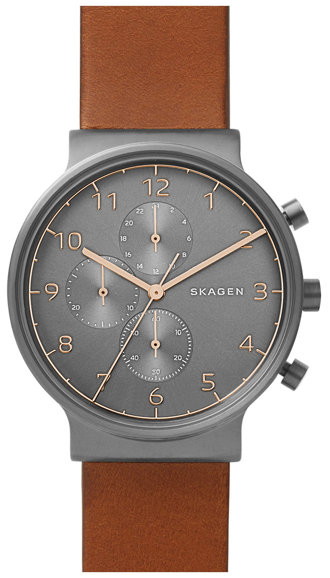 Skagen Ancher SKW6418 Chronograph -rannekellossa on suuri kompassia muistuttava ruostumattomasta teräksestä valmistettu pyöreä 40 mm leveä runko ja harmaa sunray-kellotaulu. Kellossa on 24-tunnin näyttö ja ajanotto. Pikakiinnityksen vuoksi ruskea aidosta nahasta valmistettu ranneke on helppo vaihtaa. Rannekkeen kiinnityskohdan leveys on 20 mm. Skagen-kellot toimitetaan valmistajan alkuperäisessä pakkauksessa, ja niillä on 2 vuoden takuu.