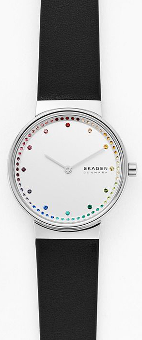 Skagen Annelie SKW2836-naisten rannekellossa on kaunis satiinihiottu valkoinen kellotaulu, joka on koristeltu usein erivärisin kristallein muodostaen sateenkaaren. Kontrastia tuo musta nappanahkaranneke, joka on pituudeltaan 14-19 cm. Rannekkeen leveys on 17 mm, ja rannekkeessa on helposti kotona vaihdettava pikakiinnitys. Runko on leveydeltään 34 mm ja paksuudeltaan 6,6 mm. Tanskalaiset Skagen-kellot toimitetaan valmistajan alkuperäisessä pakkauksessa, ja niillä on 2 vuoden takuu.