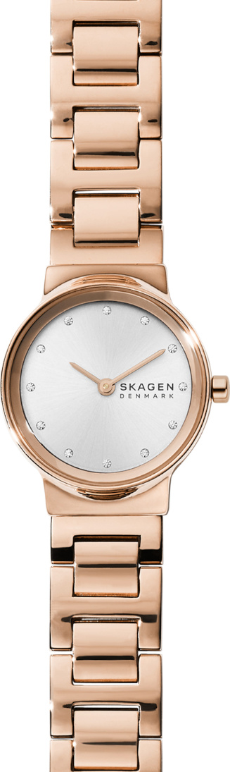 Skagen Freja rose-gold SKW2791-rannekellossa on kaunis pohjoisesta vaikutteensa saanut yksinkertaistettu kellotaulu ja kauniin pyöreä sileä runko. Kellon runko ja ranneke on ruostumatonta terästä ja kellotaulua koristaa 12 upotettua kristallia. Sunray-kellotaulu on hopeanväristä terästä. Rungon leveys on 25 mm ja paksuus on 6 mm. Rannekkeen kiinnityskohdan leveys on 11 mm. Skagen-kelloilla on 2 vuoden takuu, ja ne toimitetaan valmistajan alkuperäisessä rasiassa.