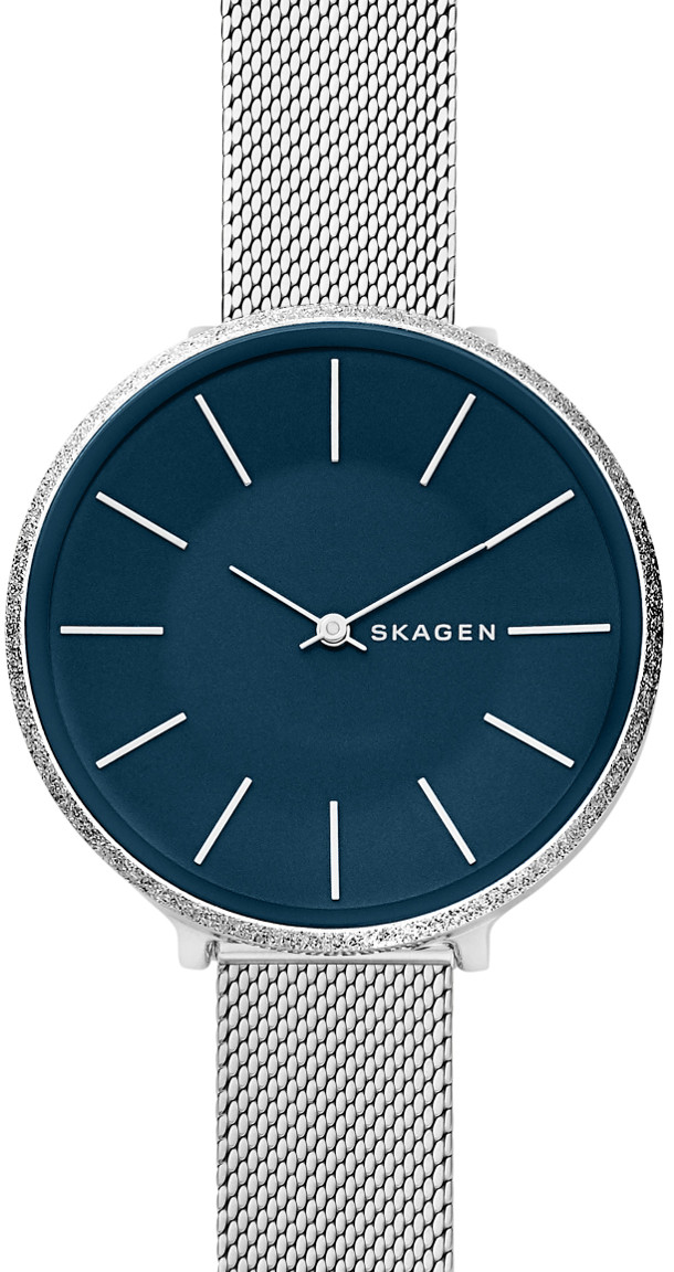 Skagen Karolina SKW2725 on erittäin viehättävä ilmestys. Kellon kaunista tummansinistä kellotaulua kiertää timanttileikattu kehä, joka suorastaan säkenöi valonsäteiden helliessä sen pintaa. Tämä Karolina-malli on muodoiltaan hoikka ja valmistettu ruostumattomasta teräksestä. Kellon rungon mitat ovat 38x7 mm ja rannekkeen leveys 14 mm.