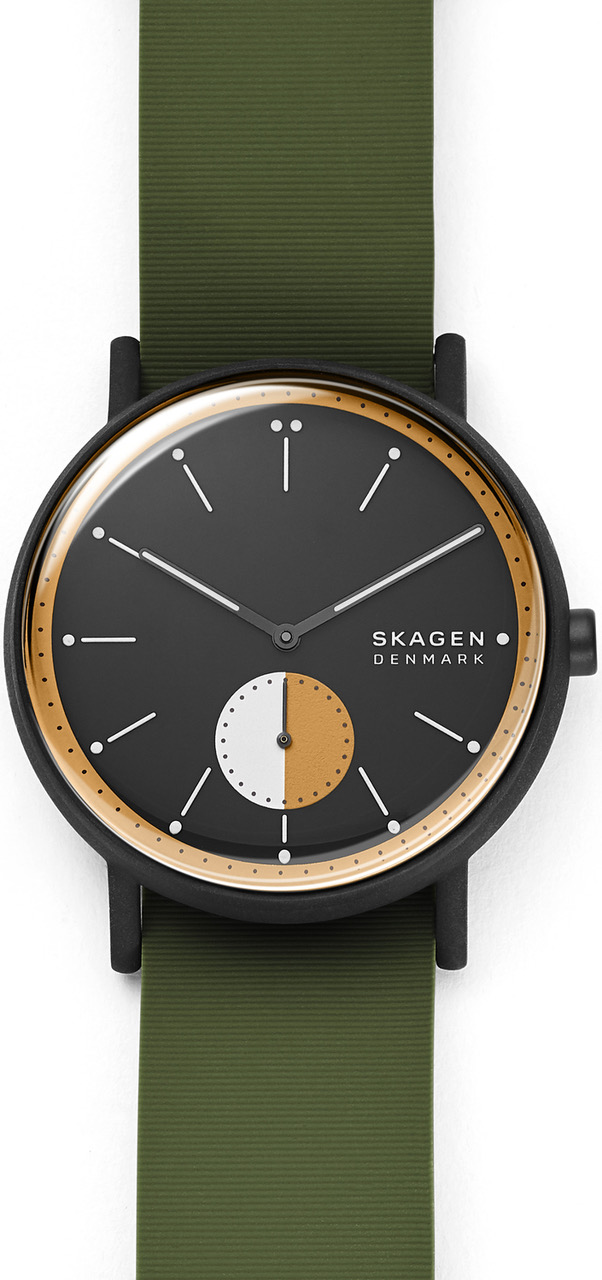 Tanskalaisessa Skagen Signatur Field SKW6541-rannekellossa on tyylikäs military-ilme ja ruskea-musta-vihreä värimaailma. Kellossa on miellyttävä nato-tyylinen silikoniranneke, joka on helppo kiinnittää ranteeseen. Musta teräsrunko on täysin pyöreä ja kellossa on kauniit suuret teräsosoittimet ja erillinen näyttö sekunneille. Rungon leveys on 42 mm ja paksuus on 11 mm. Rannekkeen pituus on 16-22,5 cm ja kiinnityskohdan leveys on 22 mm. Skagen-kelloilla on kahden vuoden takuu. ja ne toimitetaan alkuperäisessä rasiassaan.
