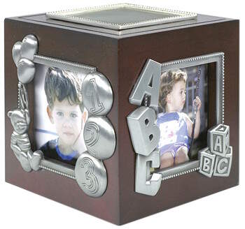 Soiva puinen kehyskuutio, 078696. Soiva kehyskuutio, jossa paikat neljälle kuvalle. Rasia alkaa soittamaan melodiaa kun pyörität jalustaa myötäpäivään. Rasia pyörii melodian tahtiin jalustan päällä. Kuution sisällä säilytystilaa esimerkiksi kastekorulle tai jollekkin muulle pienokaiselle tärkeälle esineelle.