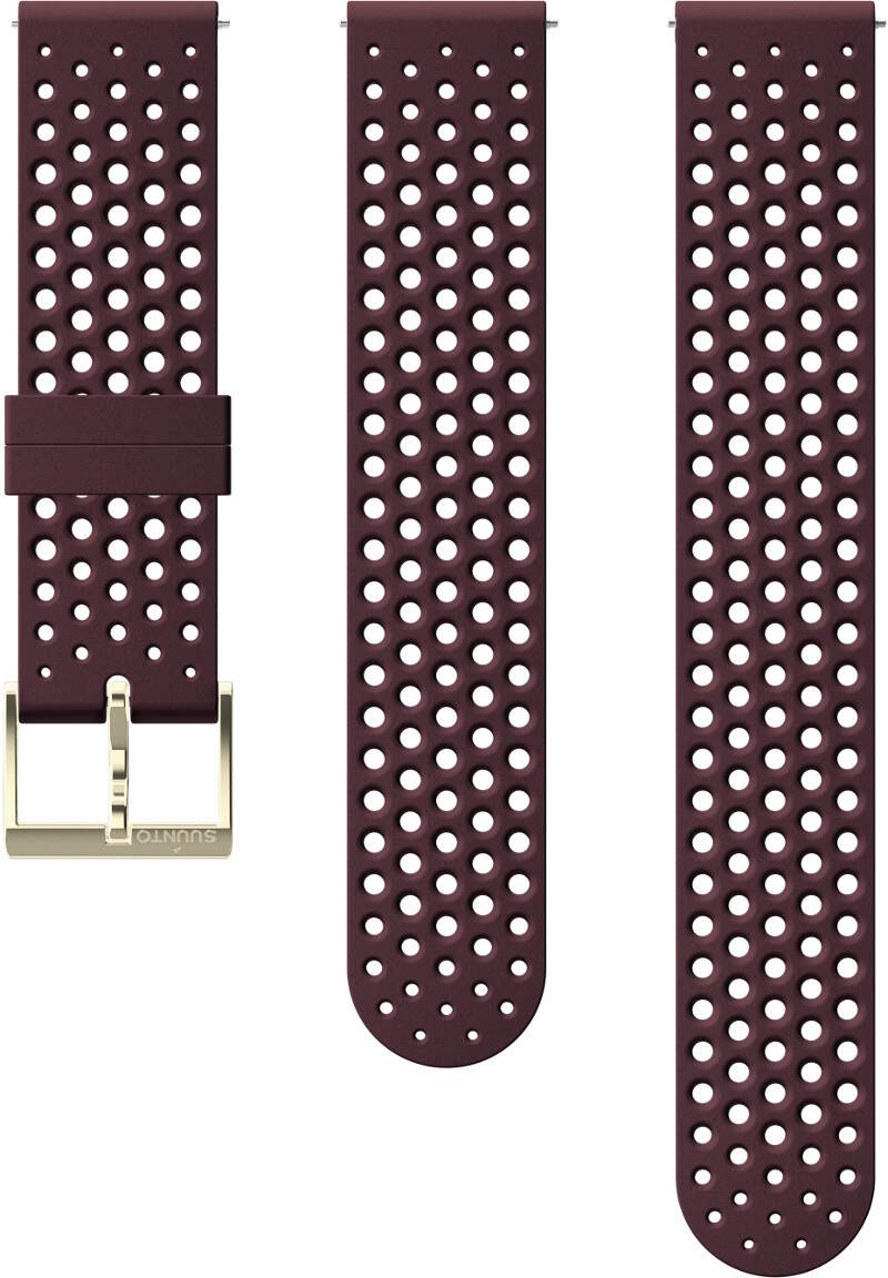 Suunto 20mm Athletic 1 Burgundy silikoniranneke SS050216000 on valmistettu laadukkaasta silikonista. Pakkaus sisältää tuotekuvan mukaisesti kolme osaa sopivuuden takaamiseksi. Ranneke sopii ranteeseen, jonka ympärysmitta on 120-220mm. Athletic-ranneke on suunniteltu hyvin hengittäväksi ja se sopii siten hyvin rankkoihin harjoituksiin. Ranneke on suunniteltu niin urheiluun kuin arkikäyttöönkin. Kaikki suunnon silikonirannekkeet istuvat mukavasti käteen ja niitä on helppo pitää puhtaana. Rannekkeet ovat kestäviä ja ne sopivat hyvin myös rankkoihin lajeihin sekä uintiin. Suunto 20mm Athletic 1 Burgundy -silikonirannekkeessa on burgundyn punainen silikoniosa ja kullanvärinen solki. Kiinnittäminen kelloon tapahtuu helposti pikajousinastan ansiosta. Vaihtoon ei siis tarvita työkaluja. Rannekkeen leveys on 20mm ja paino 13/14 grammaa. Ranneke on suunniteltu Suunto 3 Fitness -kellolle mutta se käy myös muihin kelloihin, joiden rannekkeen kiinnityskohdan leveys on 20mm.
