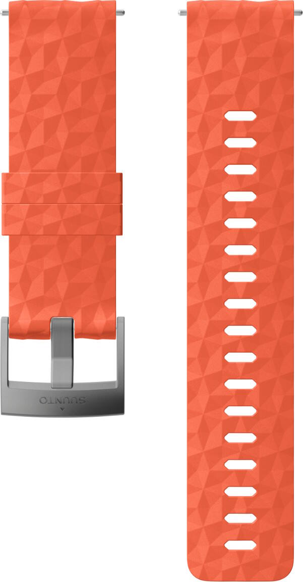 Suunto 24mm Explore 1 Coral -silikoniranneke SS050220000 on valmistettu laadukkaasta silikonista. Ranneke on suunniteltu ulkolajeihin ja harjoitteluun. Kaikki suunnon silikonirannekkeet istuvat mukavasti käteen ja niitä on helppo pitää puhtaana. Rannekkeet ovat kestäviä ja ne sopivat hyvin myös rankkoihin lajeihin sekä uintiin. Suunto 24mm Explore 1 Coral -silikonirannekkeessa on korallinpunainen silikoniosa ja harmaa solki. Kiinnittäminen kelloon tapahtuu helposti pikajousinastan ansiosta. Vaihtoon ei siis tarvita työkaluja. Rannekkeen leveys on 24mm ja paino 25 grammaa. Ranneke sopii ranteeseen, jonka ympärysmitta on välillä 130mm-230mm. Ranneke on yhteensopiva Suunto Spartan Sport, Suunto Spartan Sport Wrist HR, Sport Wrist HR Baro, Suunto 7 ja Suunto 9 kellojen kanssa. Ranneke on suunniteltu näihin kelloihin mutta sopii myös muihin kelloihin, joissa rannekkeen leveys kiinnityskohdasta on 24mm.