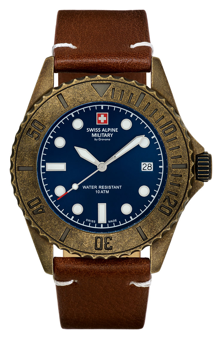 Swiss Alpine Military Master Diver Vintage 7051.1585SAM on vintage-henkinen miesten rannekello. Ruostumattomasta teräksestä valmistetussa kellossa on 42 mm leveä pronssinvärinen runko ja sininen kellotaulu. Naarmuuntumattoman safiirilasin alla numeroindeksit ja osoittimet näyttävät selkeästi aikaa, ja kellotaulusta löytyy päivyri kello kolmen kohdalta. Kellon sisällä käy Ronda Quartzin RHQ 515 -paristokoneisto. Kellossa on ruskea nahkaranneke. Swiss Alpine Military 7051.1585SAM Master Diver Vintage on vesitiivis aina 100 metriin saakka. Swiss Alpine Military-kelloille myönnetään 3 vuoden takuu, ja ne toimitetaan valmistajan alkuperäisessä rasiassa.