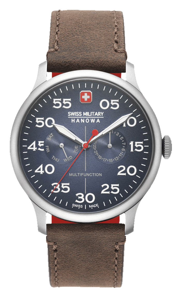 Swiss Military Hanowa Active Duty Multifunction 06-4335.04.003 on tyylikäs multifunctionkello nahkarannekkeella. Täysin ruostumattomasta teräksestä valmistettu runko on 43 mm leveä ja siinä on sininen kellotaulu. Naarmuuntumattoman safiirilasin alla suuret numeroindeksit ja osoittimet näyttävät selkeästi aikaa. Kellon sisällä käy RONDA 706.1 -paristokoneisto. Ranneke on väriltään ruskea ja runko on hopea. Swiss Military Hanowa Active Duty Multifunction 06-4335.04.003 on vesitiivis aina 100 metriin saakka. Swiss Alpine Military-kelloille myönnetään 3 vuoden takuu, ja ne toimitetaan valmistajan alkuperäisessä rasiassa.