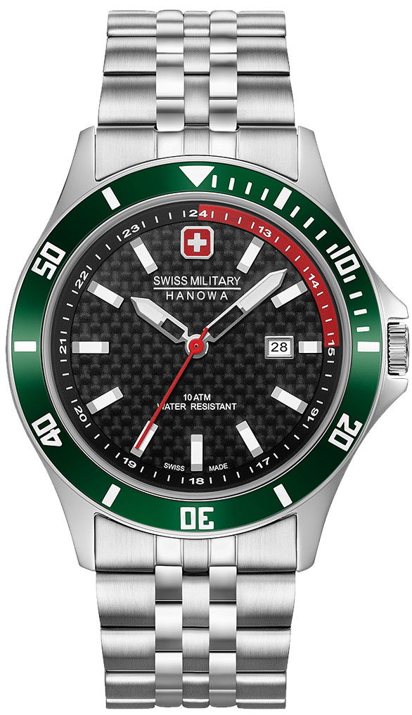 Swiss Military Hanowa Flagship Racer on vuoden 2019 uutuusmallisto, ja tämä Flagship Racer 6-5161.2.04.007.06 on varustettu tyylikkäällä mustalla koripunoskuvioidulla kellotaululla ja 20 mm leveällä teräsrannekkeella. Kelloa suojaa naarmuuntumaton safiirilasi ja urheilullisen ilmeen viimeistelee punaiset yksityiskohdat, ja taulua kiertävä vihertävä kehä, jotka antavat kellolle dynaamisen ilmeen. Sveitsissä valmistetuilla Swiss Military Hanowa -kelloilla on 3 vuoden takuu, ja ne toimitetaan valmistajan alkuperäisessä rasiassa.