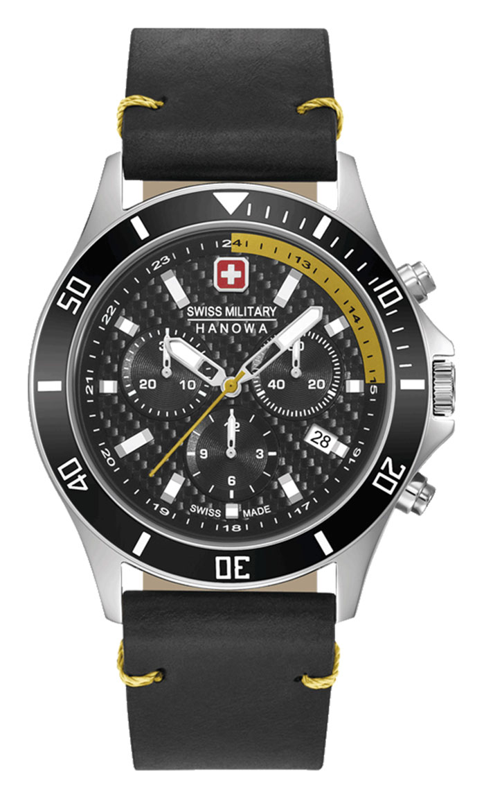 Swiss Military Hanowa Flagship Racer Chrono 06-4337.04.007.20 on kestävä kronografikello nahkarannekkeella. Täysin ruostumattomasta teräksestä valmistettu runko on 44 mm leveä ja siinä on musta kellotaulu, jota ympäröi musta kellokehä. Naarmuuntumattoman safiirilasin alla luminoidut indeksit ja osoittimet näyttävät selkeästi aikaa, ja kellotaulusta löytyy päivyri kello neljän kohdalta. Kellossa on tietenkin ajanottoominaisuus. Kellon sisällä käy RONDA 5030.D -paristokoneisto. Ranneke on väriltään musta ja runko on hopea. Swiss Military Hanowa Flagship Racer Chrono 06-4337.04.007.20 on vesitiivis aina 100 metriin saakka. Swiss Alpine Military-kelloille myönnetään 3 vuoden takuu, ja ne toimitetaan valmistajan alkuperäisessä rasiassa.