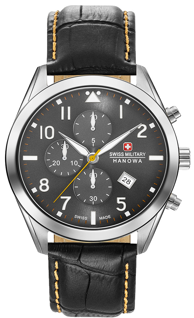 Swiss Military Hanowa Helvetus Chronograph on ajaton miesten pukukello, jossa yhdistyy tyyli ja toiminnallisuus, unohtamatta Swiss Military Hanowa -kelloille ominaisia erittäin kestäviä piirteitä. Tämä Sveitsissä valmistettu 6-4316.7.04.009-malli on varustettu kestävällä Rondan 3540D-kaliberin kellokoneistolla ja taulua suojaa naarmuuntumaton safiirilasi. Mustassa kellotaulussa on arabialaiset numerot ja kauniisti muotoillut luminoidut osoittimet, jotka näkyvät myös pimeässä, ja ajannäytön lisäksi taulussa on ajanotto ja päivyri, joille on erilliset näytöt. Kokonaisuuden viimeistelee 43 mm leveä teräsrunko, joka istuu hyvin ranteessa ja krokotiilikuvioitu 22 mm leveä musta nahkaranneke, jossa on tyylikkäät keltaiset tikkaukset. Swiss Military Hanowa -kelloilla on 3 vuoden takuu, ja ne toimitetaan valmistajan alkuperäisessä rasiassa.