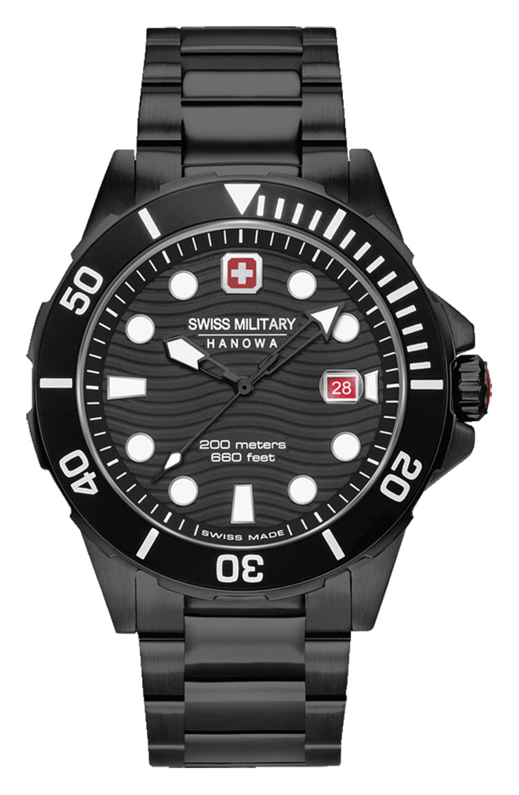 Swiss Military Hanowa Offshore Diver 06-5338.13.007 on tyylikäs, täysin musta sukeltajankello. Kokonaan ruostumattomasta teräksestä valmistettu runko on 44 mm leveä ja siinä on musta kellotaulu. Naarmuuntumattoman safiirilasin alla luminoidut indeksit ja osoittimet näyttävät selkeästi aikaa, ja kellotaulusta löytyy päivyri kello kolmen kohdalta. Kellon sisällä käy RONDA 715 -paristokoneisto. Swiss Military Hanowa Offshore Diver 06-5338.13.007 on vesitiivis aina 200 metriin saakka, joten se soveltuu hyvin jopa laitesukellukseen. Swiss Alpine Military-kelloille myönnetään 3 vuoden takuu, ja ne toimitetaan valmistajan alkuperäisessä rasiassa.