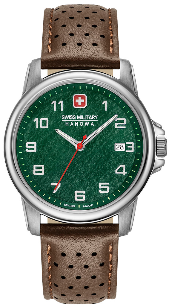 Swiss Military Hanowa Swiss Rock 6-4231.7.04.006 on rannekello hänelle, joka etsii helppopitoista ja kestävää kelloa. Swiss Rock-mallissa on hieman kapeampi 39 mm leveä runko, ja selkeälukuiset arabialaiset numerot metsänvihreällä pohjalla. Kellossa on lisäksi päivyri, ja kellotaulua suojaa erittäin kestävä naarmuuntumaton safiirilasi. Ranneke on aitoa nahkaa. Rungon leveys on 39 mm ja rannekkeen leveys 20 mm. Swiss Military Hanowa -kelloilla on 3 vuoden takuu, ja ne toimitetaan valmistajan alkuperäisessä rasiassa.