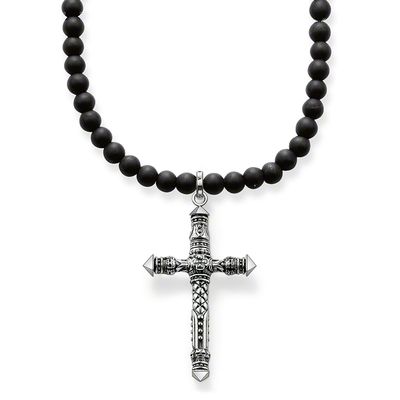 Thomas Sabo kaulakoru KE1280-023-11. Kaulakorussa olevaan hopeinen ristiriipus, jonka korkus on 4,3cm. Koru on valmistettu matta mustista obsidian kivistä ja niiden lävitse kulkee vahva kuminauha, joka venyy. Koru toimitetaan valmistajan alkuperäisessä rasiassa.