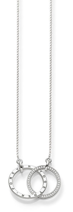 Hopea Thomas Sabo KE1489-051-14-L60v on hyvä lahjaidea jollekin tärkeälle ihmiselle. Korun muotoilu sekä teksti "Forever together" kuvaavat kahden ihmisen yhteenkuuluvuutta. Toisessa renkaassa koristeena säihkyviä zirkoneja. Ketju on pituudeltaan 60 cm ja lyhyemmäksi sitä saa säädettyä papukaijalukkoa siirtämällä. Riipusosion leveys on 3,5 cm. Thomas Sabo tuotteet toimitetaan valmistajan alkuperäisessä lahjapakkauksessa.