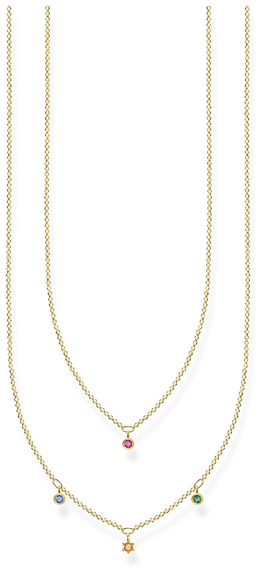 Thomas Sabo kaulakoru KE2078-488-7-L45V on kaksiketjuinen kullattu kaulakoru. Ihanassa kaulakorussa roikkuu yhteensä neljä eriväristä zirkoniaa. Ketju on säädettävissä 40 - 42,5 - 45 cm. Koru on valmistettu laadukkaasta sterling-hopeasta. Thomas Sabo-korut toimitetaan valmistajan alkuperäisessä pakkauksessa.