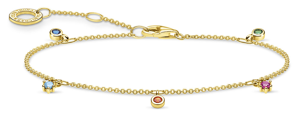 Thomas Sabo rannekoru A1998-488-7-L19V -rannekorussa riippuu kullatussa ketjussa viisi eri väristä zirkoniaa. Rannekkeen pituus on säädettävissä 16 - 19 cm välillä. Koru on valmistettu laadukkaasta sterling-hopeasta. Thomas Sabo-korut toimitetaan valmistajan alkuperäisessä pakkauksessa.