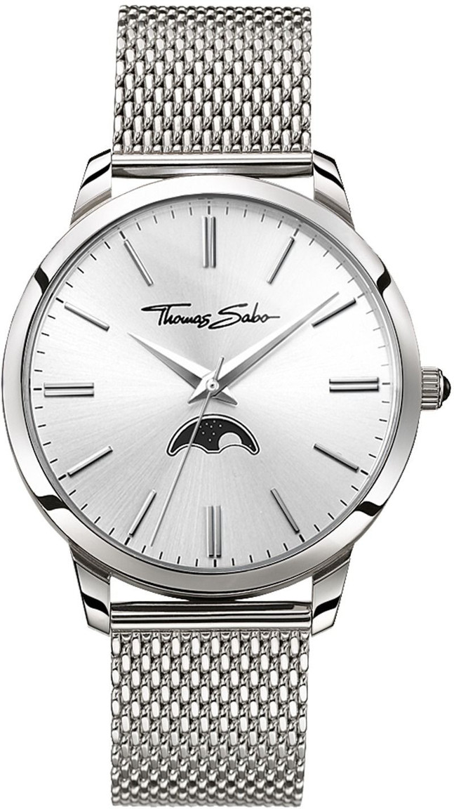 Thomas Sabo Rebel Spirit Moonphase WA0324 -rannekellosta löytyy harvinaislaatuinen kuun vaiheen osoitin. Hopeanvärinen sunray-kellotaulu ja mustalla onyksilla koristeltu säätönuppi ovat nekin komeita, arvokkuutta lisääviä yksityiskohtia. 42 mm teräsrunko pitää sisällään laadukkaan japanilaisen Miyota 6P24 -koneiston. Mineraalilasin päällä on ohut safiiripinnoite, joka tekee kellotaulusta heijastamattoman ja entistä kestävämmän naarmuuntumista vastaan. Saatavilla myös mustalla kellotaululla ja nahkarannekkeella.