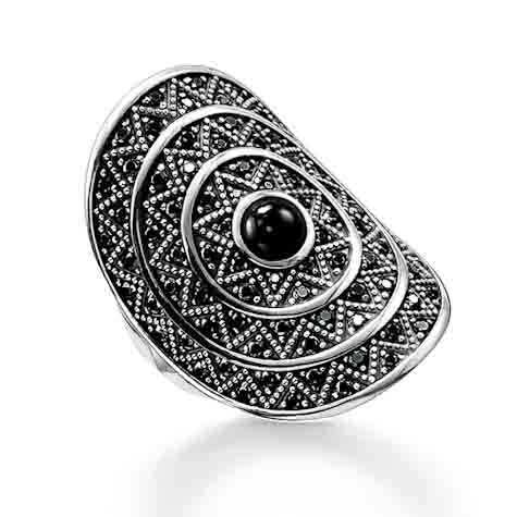 Thomas Sabo TR2053-641-11 sormuksen keskipisteenä on musta ympyränmuotoinen onyksi korukivi, jota ympäröi tyylikäs siksak kuviointi mustilla zirconioilla. Sormus on valmistettu laadukkaasta hopeasta. Koru toimitetaan valmistajan alkuperäisessä lahjarasiassa.