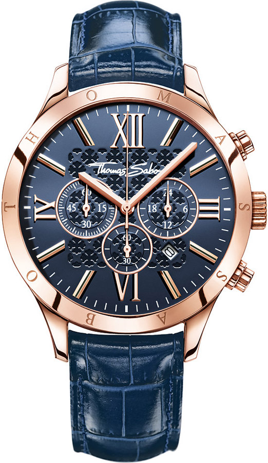 Miesten Thomas Sabo WA0211 rannekello on täydellinen vaihtoehto herrasmiehelle, joka arvostaa tyylikkyyttä. Ruostumattomasta teräksestä valmistetun, punakullan värisen rungon leveys on 43 mm ja paksuus 12 mm. Tummansinisen aidon nahkarannekkeen leveys on 20 mm. Rannekkeen pinta on kohokuvioitu muistuttamaan krokotiiliä.  Ominaisuuksina kellossa on kronografi eli ajanotto sekä päivyri. Kellossa on kovetettu ja heijastamaton mineraalilasi, jossa on naarmuuntumaton safiirilasipinnoite. Koneistona kellossa on Japanilainen MIYOTA OS2A. Laadukkaille Thomas Sabo rannekelloille myönnetään kahden vuoden takuu ja tuote toimitetaan valmistajan alkuperäisessä rasiassa.