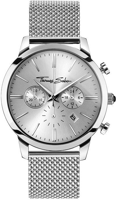 Thomas Sabo WA0244 Eternal Rebel Chrono kello on hopeanvärinen ja siinä on näyttävä mesh-ranneke. Ominaisuuksina ajanotto sekä päivyri. Ruostumattomasta teräksestä valmistetun rungon leveys on 42 mm ja paksuus 11 mm. Rannekkeen leveys kiinnityskohdasta on 20 mm. Kellossa on kovetettu ja heijastamaton mineraalilasi, jossa on naarmuuntumaton safiirilasipinnoite. Koneistona kellossa on Japanilainen MIYOTA JS25 paristokoneisto. Laadukkaille Thomas Sabo rannekelloille myönnetään kahden vuoden takuu ja tuote toimitetaan valmistajan alkuperäisessä rasiassa.